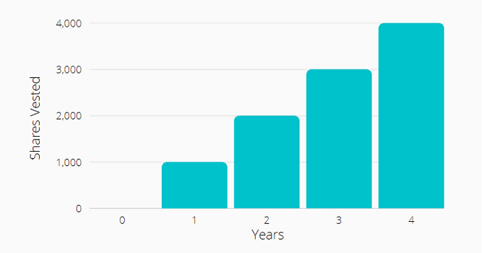Idea 3: 1-year cliff vesting over 4 years – This idea is similar to the first one but it enables employees to vest a portion of equity (e.g. 1000 out of 4000 shares) after the first year. So they can exercise the shares and/or sell them for profit. After that, vesting occurs monthly. This is a common vesting schedule among private companies.